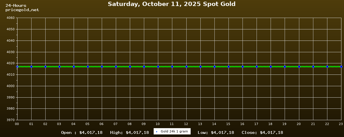 في يوم السبت، ١١ أكتوبر ٢٠٢٥ بلغ سعر الذهب للأوقية (الأونصة) الواحدة $4,017.18. وبلغ سعر الجرام الذهب الواحد $129.16. وقد وصل أعلى سعر للذهب في هذا اليوم $4,017.18، بينما كان أدنى سعر $4,017.18.
