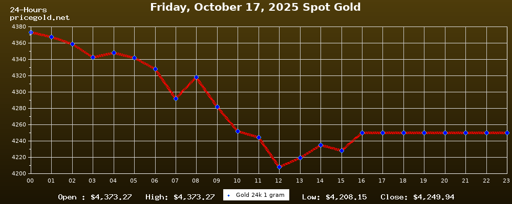 في يوم الجمعة، ١٧ أكتوبر ٢٠٢٥ بلغ سعر الذهب للأوقية (الأونصة) الواحدة $4,249.94. وبلغ سعر الجرام الذهب الواحد $136.64. وقد وصل أعلى سعر للذهب في هذا اليوم $4,373.27، بينما كان أدنى سعر $4,208.15.