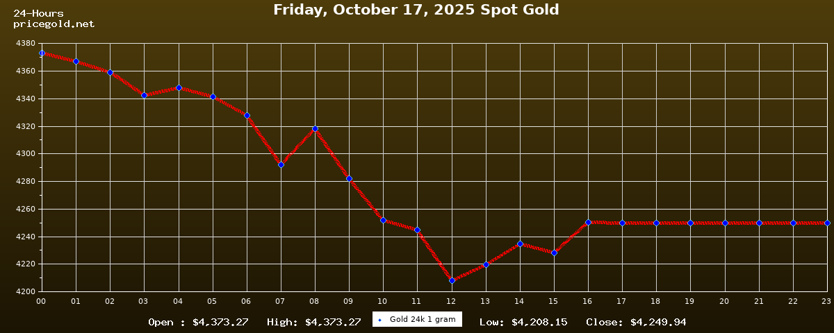 في يوم الجمعة، ١٧ أكتوبر ٢٠٢٥ بلغ سعر الذهب للأوقية (الأونصة) الواحدة $4,249.94. وبلغ سعر الجرام الذهب الواحد $136.64. وقد وصل أعلى سعر للذهب في هذا اليوم $4,373.27، بينما كان أدنى سعر $4,208.15.