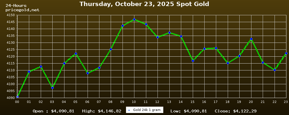 في يوم الخميس، ٢٣ أكتوبر ٢٠٢٥ بلغ سعر الذهب للأوقية (الأونصة) الواحدة $4,122.29. وبلغ سعر الجرام الذهب الواحد $132.53. وقد وصل أعلى سعر للذهب في هذا اليوم $4,146.82، بينما كان أدنى سعر $4,090.81.