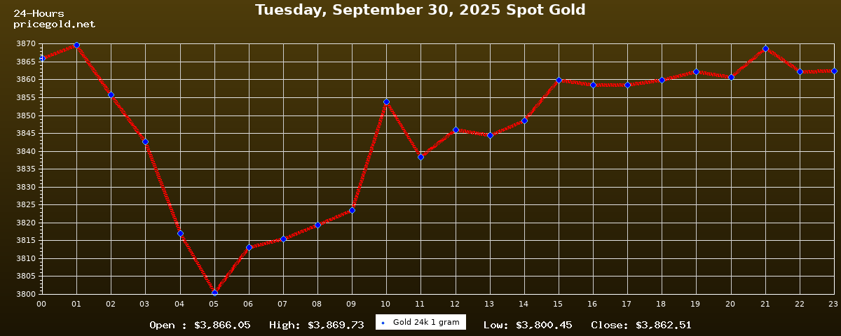 في يوم الثلاثاء، ٣٠ سبتمبر ٢٠٢٥ بلغ سعر الذهب للأوقية (الأونصة) الواحدة $3,862.51. وبلغ سعر الجرام الذهب الواحد $124.18. وقد وصل أعلى سعر للذهب في هذا اليوم $3,869.73، بينما كان أدنى سعر $3,800.45.