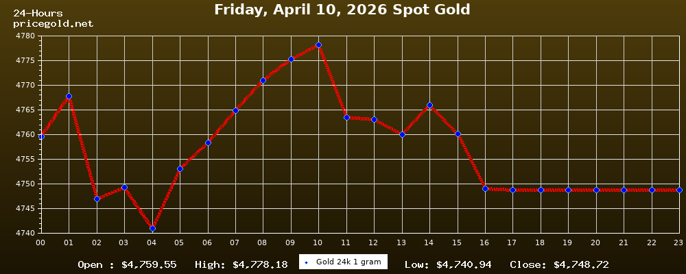 في يوم الجمعة، ١٠ أبريل ٢٠٢٦ بلغ سعر الذهب للأوقية (الأونصة) الواحدة $4,748.72. وبلغ سعر الجرام الذهب الواحد $152.68. وقد وصل أعلى سعر للذهب في هذا اليوم $4,778.18، بينما كان أدنى سعر $4,740.94.