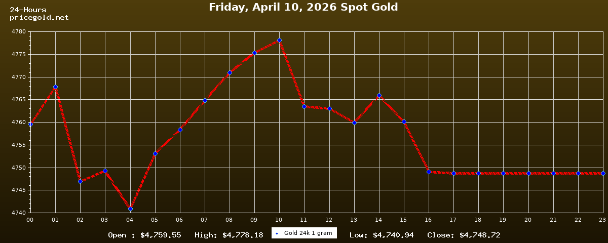 في يوم الجمعة، ١٠ أبريل ٢٠٢٦ بلغ سعر الذهب للأوقية (الأونصة) الواحدة $4,748.72. وبلغ سعر الجرام الذهب الواحد $152.68. وقد وصل أعلى سعر للذهب في هذا اليوم $4,778.18، بينما كان أدنى سعر $4,740.94.