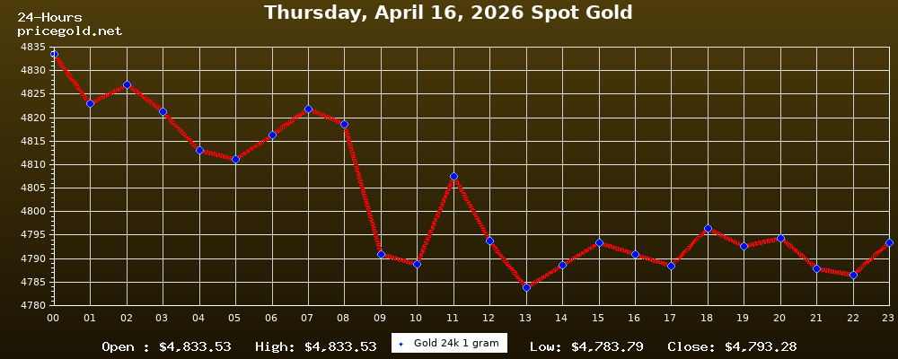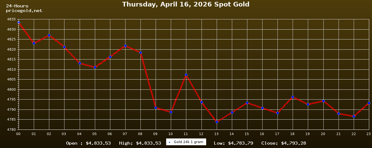 في يوم الخميس، ١٦ أبريل ٢٠٢٦ بلغ سعر الذهب للأوقية (الأونصة) الواحدة $4,793.28. وبلغ سعر الجرام الذهب الواحد $154.11. وقد وصل أعلى سعر للذهب في هذا اليوم $4,833.53، بينما كان أدنى سعر $4,783.79.