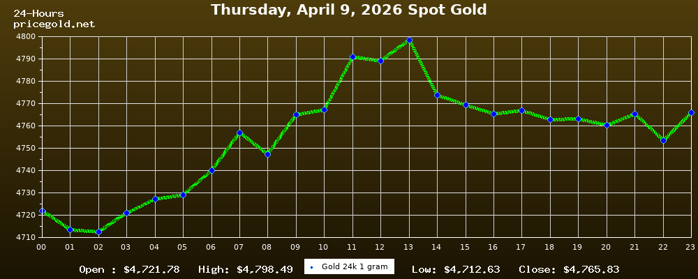في يوم الخميس، ٩ أبريل ٢٠٢٦ بلغ سعر الذهب للأوقية (الأونصة) الواحدة $4,765.83. وبلغ سعر الجرام الذهب الواحد $153.22. وقد وصل أعلى سعر للذهب في هذا اليوم $4,798.49، بينما كان أدنى سعر $4,712.63.