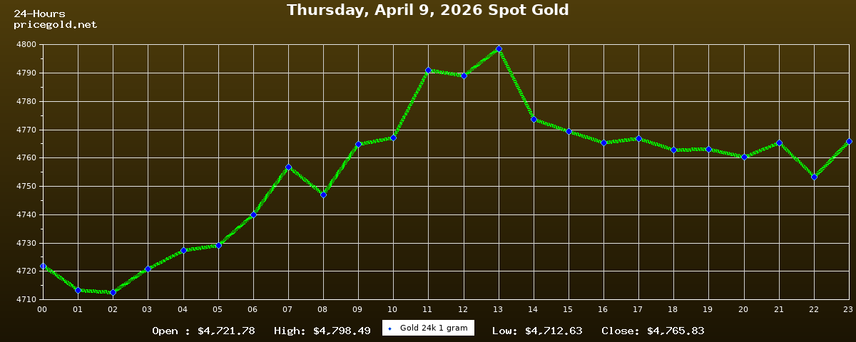 في يوم الخميس، ٩ أبريل ٢٠٢٦ بلغ سعر الذهب للأوقية (الأونصة) الواحدة $4,765.83. وبلغ سعر الجرام الذهب الواحد $153.22. وقد وصل أعلى سعر للذهب في هذا اليوم $4,798.49، بينما كان أدنى سعر $4,712.63.