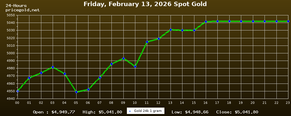 في يوم الجمعة، ١٣ فبراير ٢٠٢٦ بلغ سعر الذهب للأوقية (الأونصة) الواحدة $5,041.80. وبلغ سعر الجرام الذهب الواحد $162.10. وقد وصل أعلى سعر للذهب في هذا اليوم $5,041.80، بينما كان أدنى سعر $4,948.66.