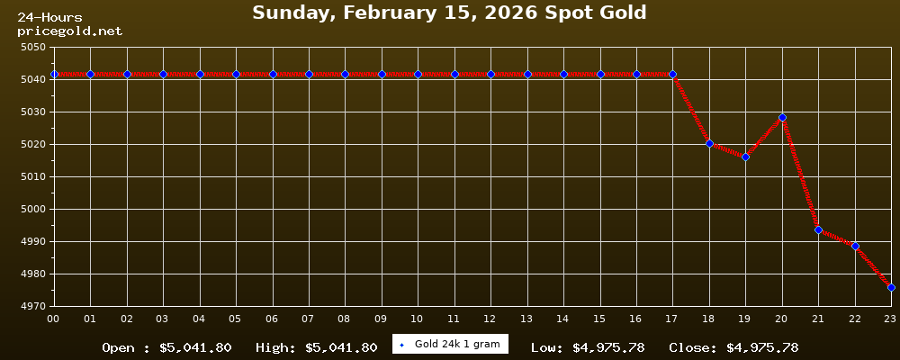 في يوم الأحد، ١٥ فبراير ٢٠٢٦ بلغ سعر الذهب للأوقية (الأونصة) الواحدة $4,975.78. وبلغ سعر الجرام الذهب الواحد $159.98. وقد وصل أعلى سعر للذهب في هذا اليوم $5,041.80، بينما كان أدنى سعر $4,975.78.