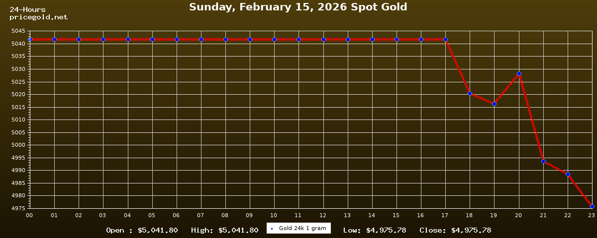 في يوم الأحد، ١٥ فبراير ٢٠٢٦ بلغ سعر الذهب للأوقية (الأونصة) الواحدة $4,975.78. وبلغ سعر الجرام الذهب الواحد $159.98. وقد وصل أعلى سعر للذهب في هذا اليوم $5,041.80، بينما كان أدنى سعر $4,975.78.