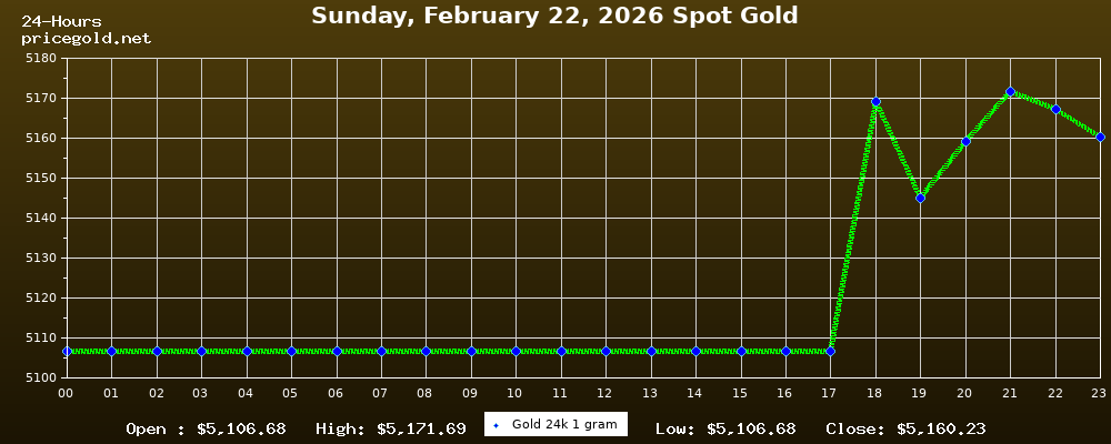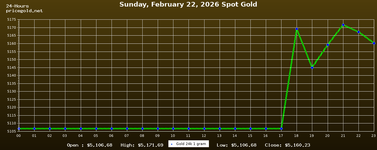في يوم الأحد، ٢٢ فبراير ٢٠٢٦ بلغ سعر الذهب للأوقية (الأونصة) الواحدة $5,160.23. وبلغ سعر الجرام الذهب الواحد $165.91. وقد وصل أعلى سعر للذهب في هذا اليوم $5,171.69، بينما كان أدنى سعر $5,106.68.