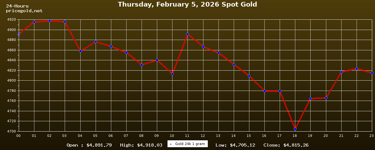 في يوم الخميس، ٥ فبراير ٢٠٢٦ بلغ سعر الذهب للأوقية (الأونصة) الواحدة $4,815.26. وبلغ سعر الجرام الذهب الواحد $154.81. وقد وصل أعلى سعر للذهب في هذا اليوم $4,918.03، بينما كان أدنى سعر $4,705.12.