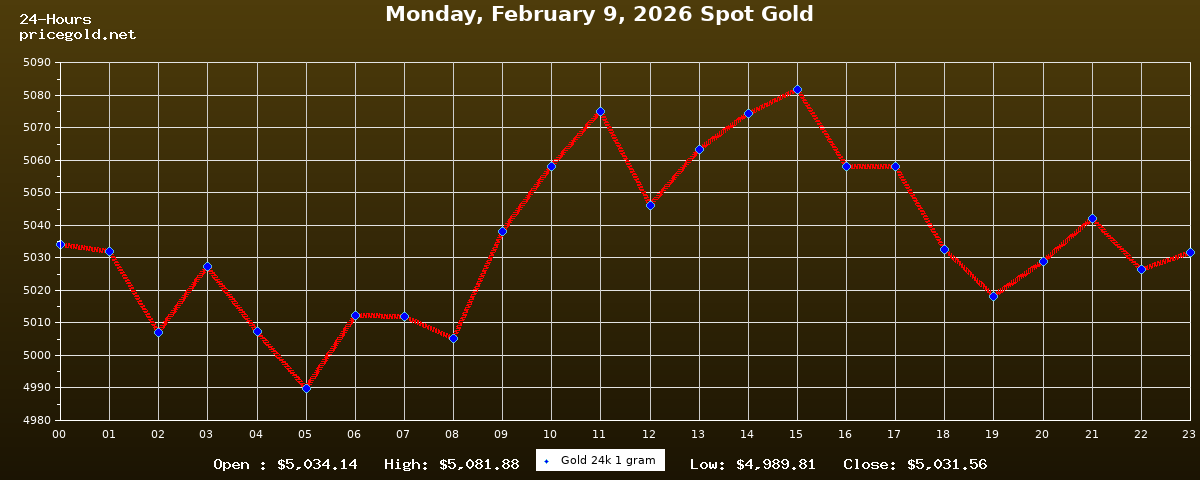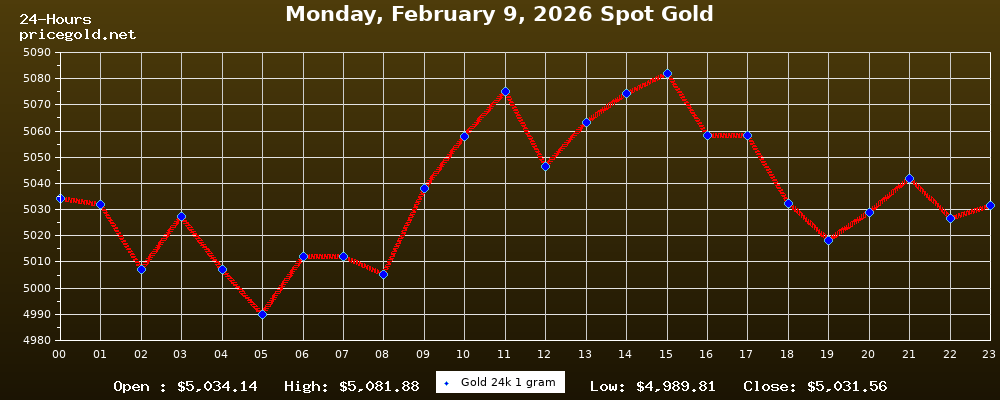 في يوم الاثنين، ٩ فبراير ٢٠٢٦ بلغ سعر الذهب للأوقية (الأونصة) الواحدة $5,031.56. وبلغ سعر الجرام الذهب الواحد $161.77. وقد وصل أعلى سعر للذهب في هذا اليوم $5,081.88، بينما كان أدنى سعر $4,989.81.