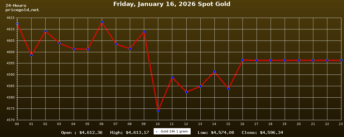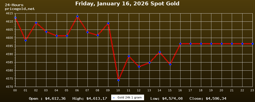 في يوم الجمعة، ١٦ يناير ٢٠٢٦ بلغ سعر الذهب للأوقية (الأونصة) الواحدة $4,596.34. وبلغ سعر الجرام الذهب الواحد $147.78. وقد وصل أعلى سعر للذهب في هذا اليوم $4,613.17، بينما كان أدنى سعر $4,574.08.