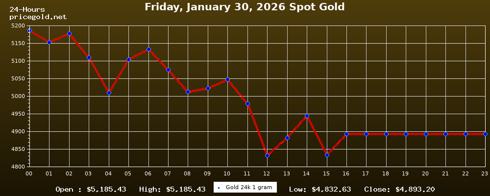 في يوم الجمعة، ٣٠ يناير ٢٠٢٦ بلغ سعر الذهب للأوقية (الأونصة) الواحدة $4,893.20. وبلغ سعر الجرام الذهب الواحد $157.32. وقد وصل أعلى سعر للذهب في هذا اليوم $5,185.43، بينما كان أدنى سعر $4,832.63.