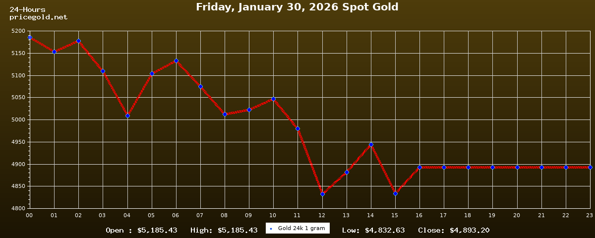 في يوم الجمعة، ٣٠ يناير ٢٠٢٦ بلغ سعر الذهب للأوقية (الأونصة) الواحدة $4,893.20. وبلغ سعر الجرام الذهب الواحد $157.32. وقد وصل أعلى سعر للذهب في هذا اليوم $5,185.43، بينما كان أدنى سعر $4,832.63.