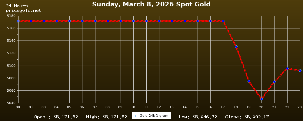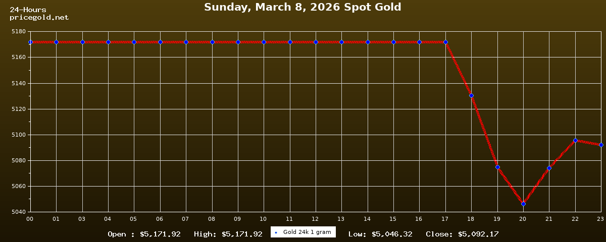 في يوم الأحد، ٨ مارس ٢٠٢٦ بلغ سعر الذهب للأوقية (الأونصة) الواحدة $5,092.17. وبلغ سعر الجرام الذهب الواحد $163.72. وقد وصل أعلى سعر للذهب في هذا اليوم $5,171.92، بينما كان أدنى سعر $5,046.32.