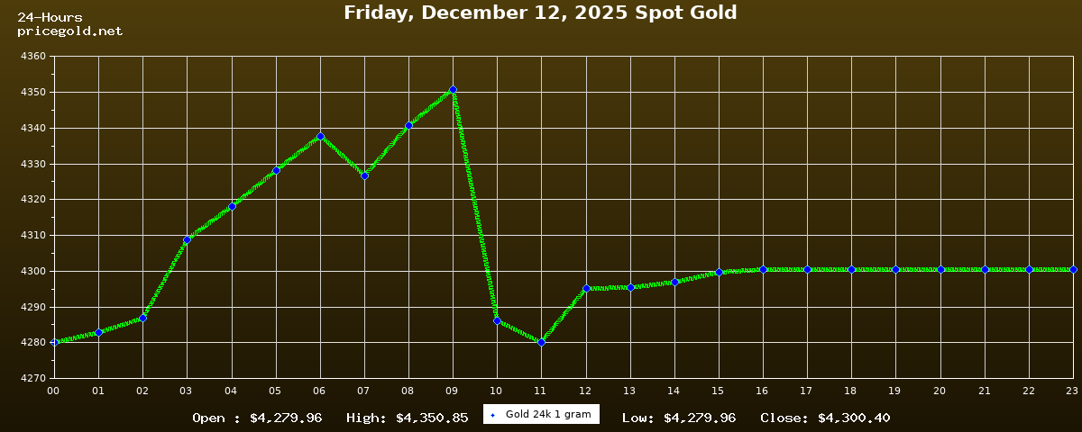 12 Aralık 2025 Cuma günü altının ons fiyatı $4.300,40. Altının gram fiyatı $138,26. Altının bugün en yüksek fiyatı $4.350,85, en düşük fiyatı ise $4.279,96.