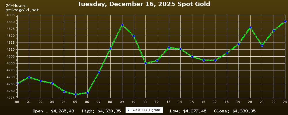 16 Aralık 2025 Salı günü altının ons fiyatı $4.330,35. Altının gram fiyatı $139,22. Altının bugün en yüksek fiyatı $4.330,35, en düşük fiyatı ise $4.277,48.