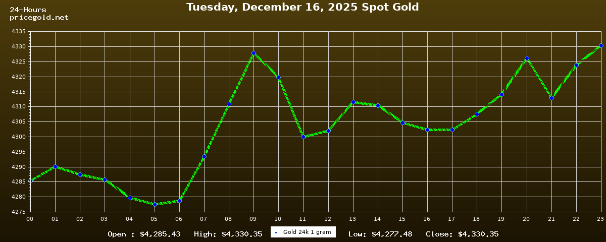 16 Aralık 2025 Salı günü altının ons fiyatı $4.330,35. Altının gram fiyatı $139,22. Altının bugün en yüksek fiyatı $4.330,35, en düşük fiyatı ise $4.277,48.