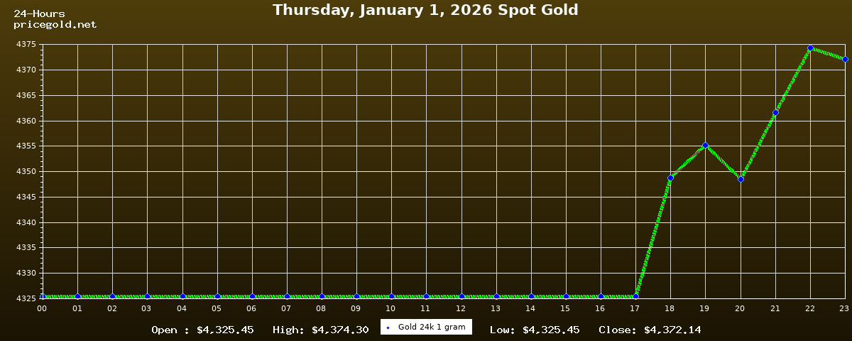1 Ocak 2026 Perşembe günü altının ons fiyatı $4.372,14. Altının gram fiyatı $140,57. Altının bugün en yüksek fiyatı $4.374,30, en düşük fiyatı ise $4.325,45.