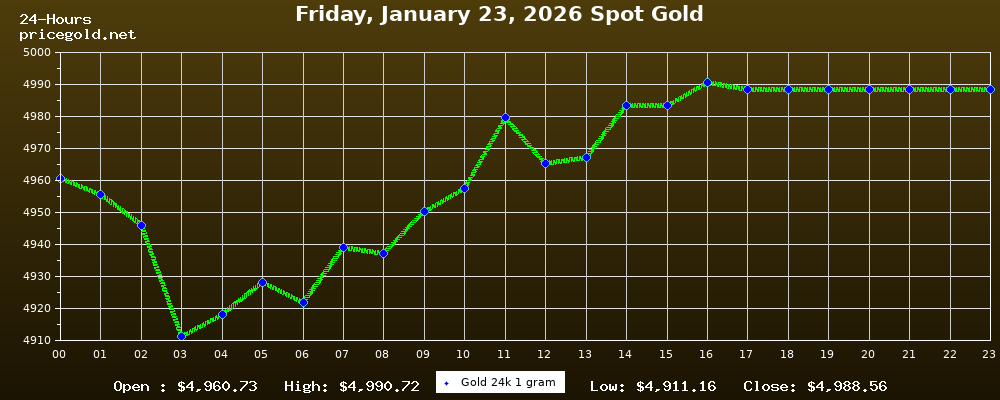 23 Ocak 2026 Cuma günü altının ons fiyatı $4.988,56. Altının gram fiyatı $160,39. Altının bugün en yüksek fiyatı $4.990,72, en düşük fiyatı ise $4.911,16.