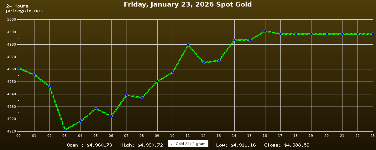 23 Ocak 2026 Cuma günü altının ons fiyatı $4.988,56. Altının gram fiyatı $160,39. Altının bugün en yüksek fiyatı $4.990,72, en düşük fiyatı ise $4.911,16.